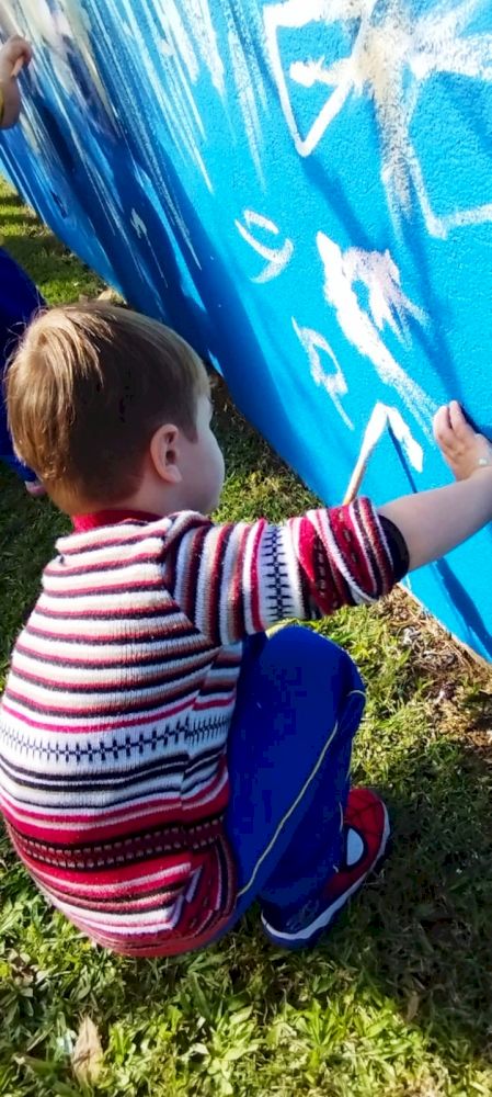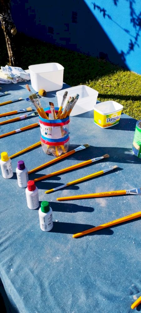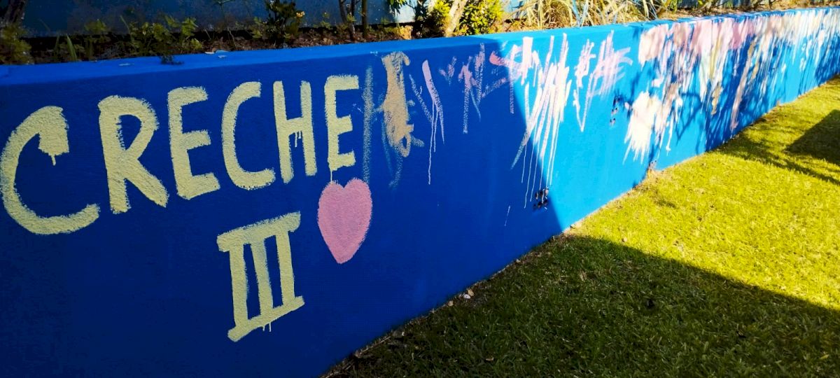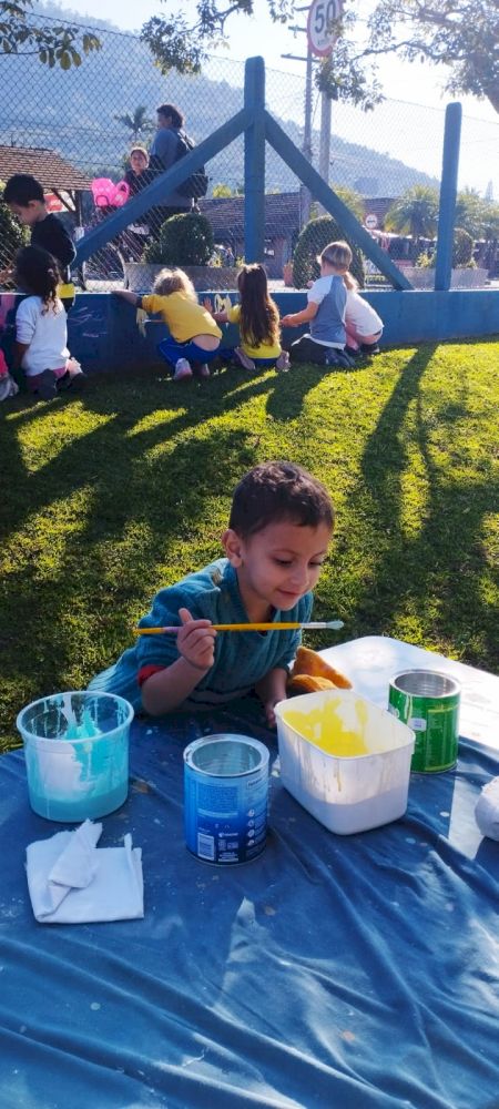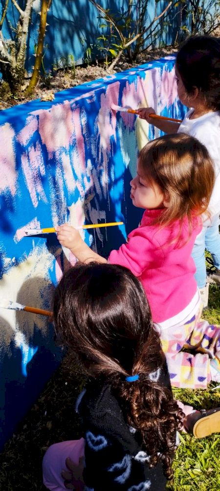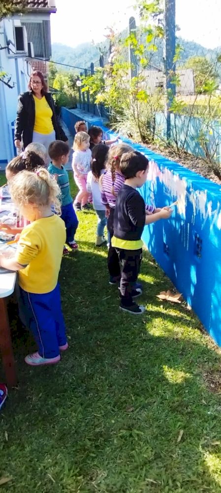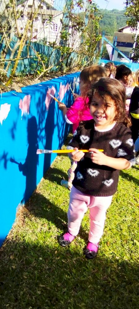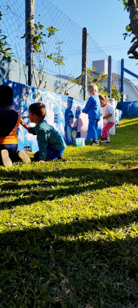 Como trabalhar nas áreas externas sempre é um convite irrecusável para a diversão aliada ao aprendizado, aproveitaram o lindo dia de sol para brincarem de “SEREM PINTORES” e fizeram muita arte nos muros do Ceim!