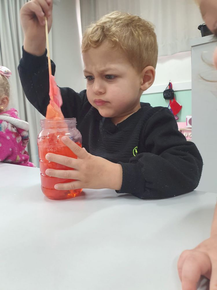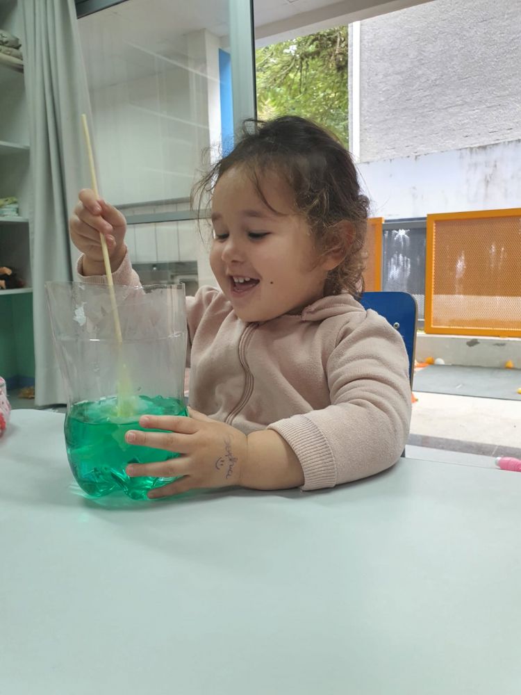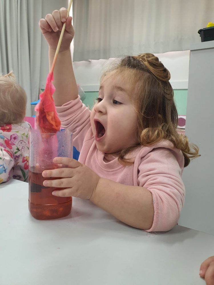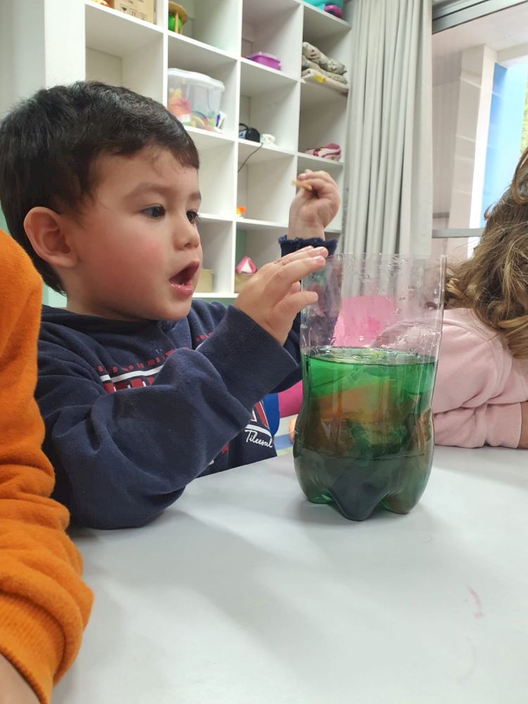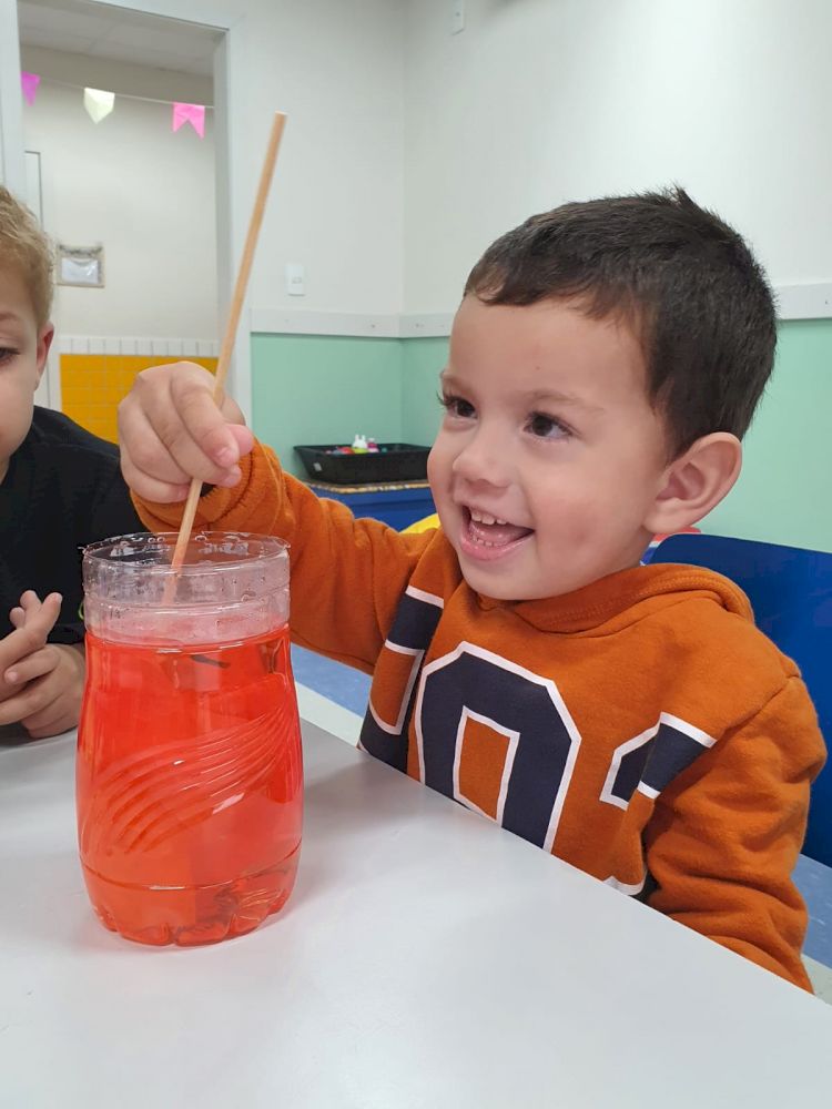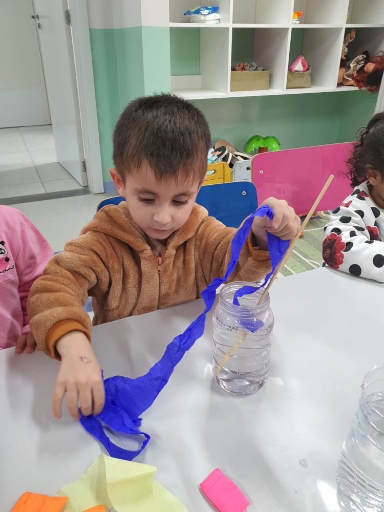 Criança não aprende só isso, ela aprende ciência química, ciência física e na observação das coisas. Por exemplo, quando uma criança observa a transformação dos estados da água, ela está vendo um fenômeno químico e outro físico, de mudanças, além de um fenômeno natural que ele pode observar na água da chuva e tudo mais. A Turma da Creche 2B fez experiências utilizando papel crepom e água morna para novas descobertas.