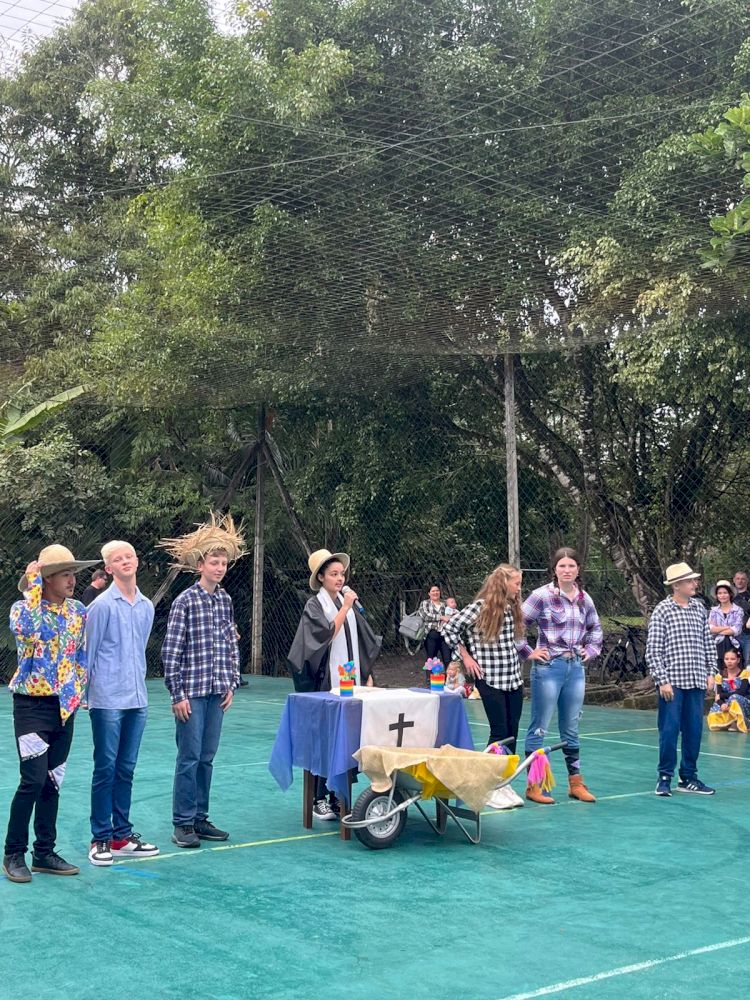 Teve diversas apresentações como o casamento caipira, a dança do pau-de-fitas, quadrilha, desafios e muita dança.