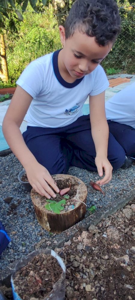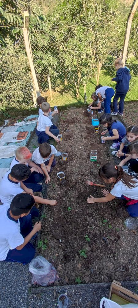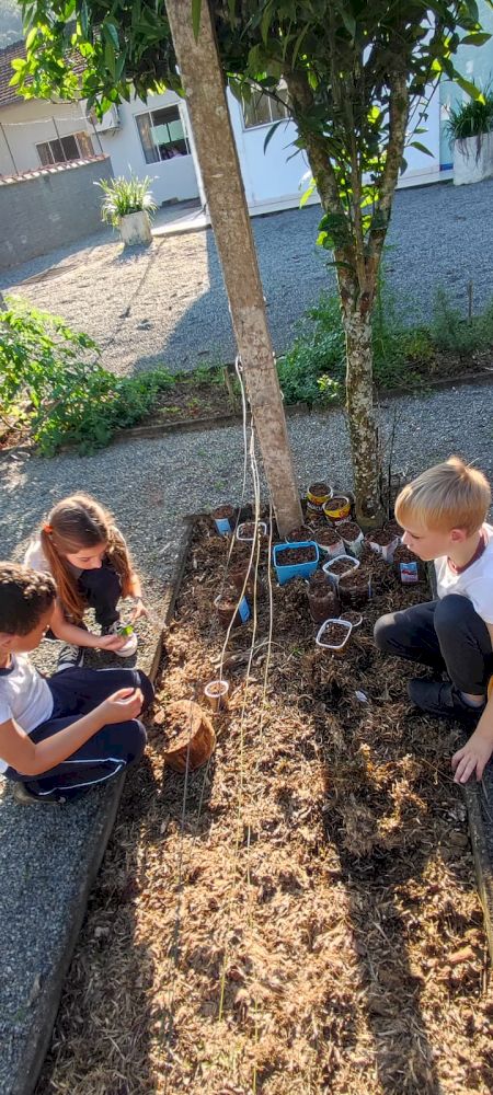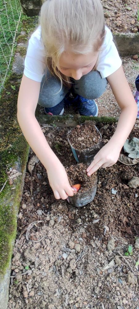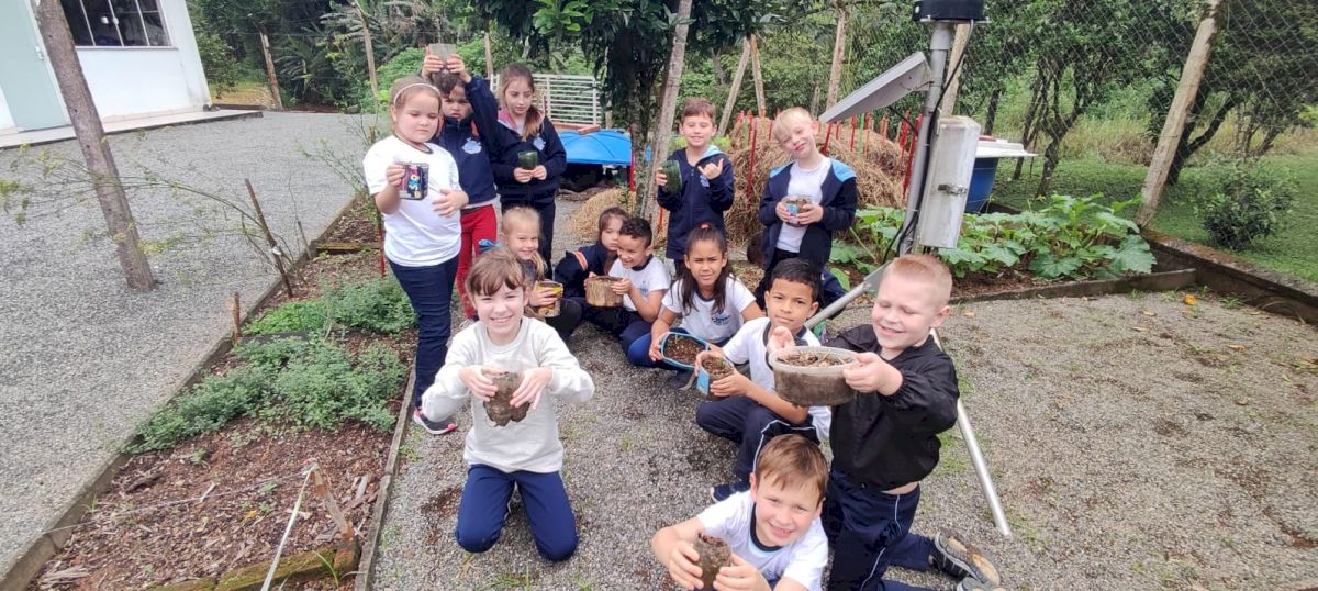 Na sequência, cada criança plantou a semente da araucária (pinhão), que já está brotando.