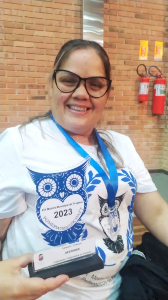 A professora Arleisa Farias de Andrade participou da 19ª Mostra Municipal de Projetos Pedagógicos de Pomerode, com o trabalho “Fora da Caixa” na categoria Professor, projeto este que foi desenvolvido com as crianças da Creche 1 A, conquistando o Destaque em Criatividade e Originalidade da Pesquisa.