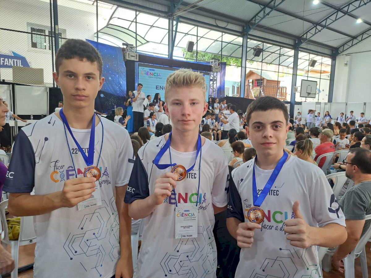 Os alunos Nathanael Franz Dias, Felipe Bernardino e Adryan Adriel Butzke, entre os dias 16 e 18 de novembro, participaram da 22ª FITEC (Feira Interativa de Tecnologia e Ciência) na cidade de Londrina – PR, onde conquistaram uma medalha de bronze pelo 3° lugar. A feira contou com trabalhos desenvolvidos por alunos do ensino fundamental e médio de diversas cidades do Brasil.