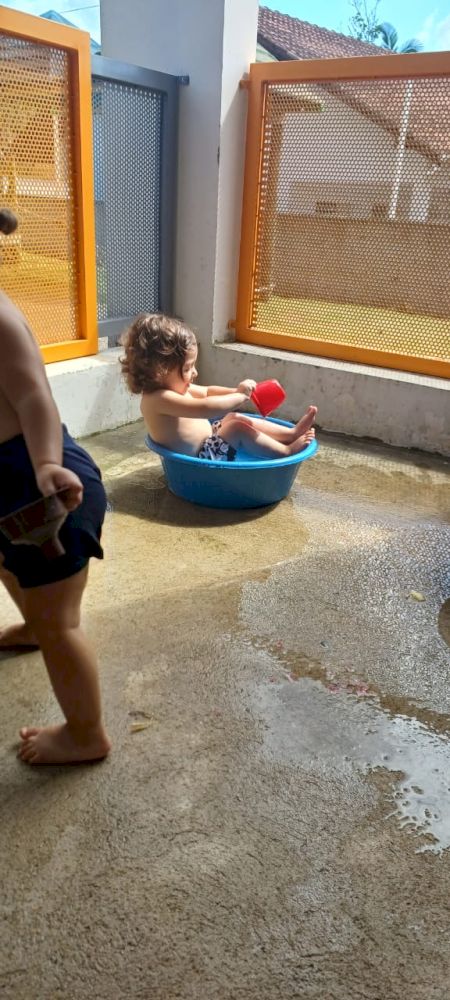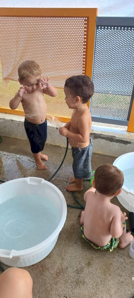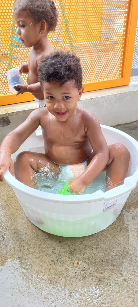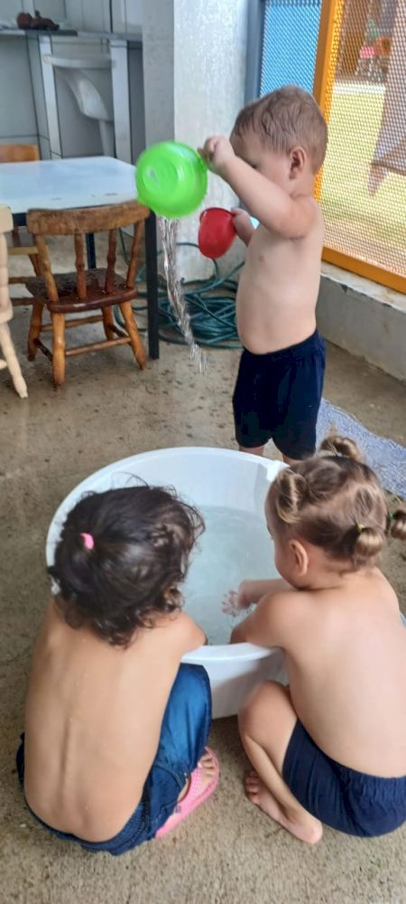 Em um dia muito quente as crianças da creche 1B foram convidadas para o solário da sala, que estava organizado com bacias com água e potes para que as crianças pudessem experimenta a sensação de molhar-se. Nossa auxiliar de educação infantil estava com a mangueira que logo chamou a atenção dos meninos que se divertiram ganhando jatinhos de água na barriga, ao tampar um pouco a ponta da mangueira com um dedo. Alguns sentaram nas bacias e usaram os potinhos para jogar água em si, no colega ou para fora, foram momentos refrescantes que deixaram nossa tarde mais gostosa e super divertida.