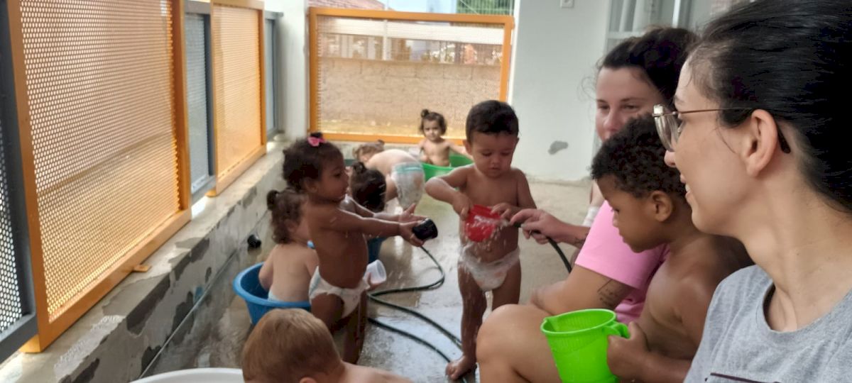 Muito mais do que refrescar do calor, a proposta com água amplia a sensibilidade da criança e desenvolve noções como transbordar, transferir, molhar, secar, entre muitas outras.