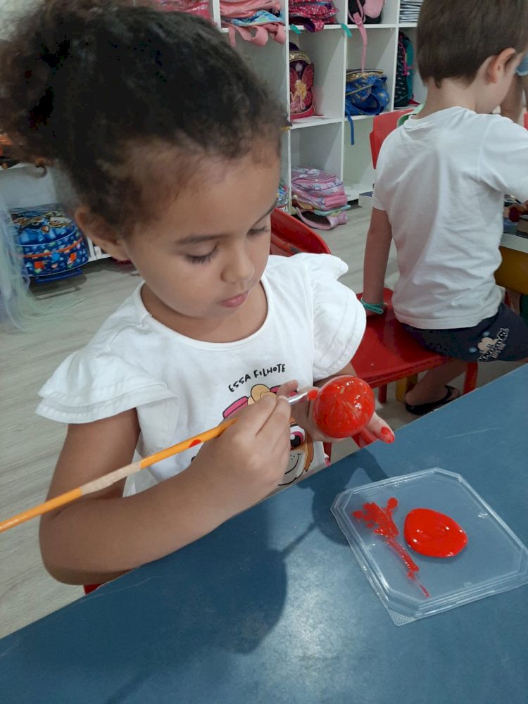 As crianças da turma do Pré 1 A conversaram sobre o tema do maior ovo de Páscoa desse ano e sobre a artista plástica Marcela Schmidt que assinou a obra. Observaram através de gravuras que no ovo foi pintado três casas com fachadas enxaimel, flores e plantas. A aluna Clara Liz, toda empolgada, logo escolheu a cor amarela para dar a primeira camada ao seu ovo, pois como ela falou – “vou fazer com amarelo, pois é a cor mais linda do Mundo”. Após, muito concentrada desenhou ovos de páscoa coloridos no mesmo e um lindo arco-íris. Clara Liz sendo uma menina muito detalhista concluiu a pintura de seu ovo com minuciosos detalhes. Dessa forma conquistou o 2º lugar no concurso na modalidade pré-escola, categoria III – pintura.