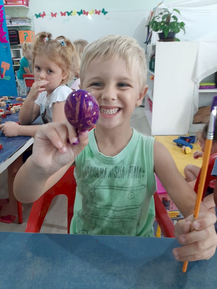 O Luan do Pré 1B, fez a atividade com sua família em casa. Pintou sua casquinha utilizando a técnica de cozimento. Para decoração da casquinha a família utilizou beterraba, cúrcuma e elementos da natureza como folhas, galhos e flores. Colocaram a casquinha dentro da panela com uma mistura de água, vinagre e sal mais os elementos da natureza, envolvendo a casquinha com folhas e flores. Ferveram por 2 horas e depois deixaram de molho por mais de 6 a 8 horas. Por fim, removeram os elementos da natureza envolta à casquinha e a deixaram secar. Assim, conquistou o 2º lugar no concurso na modalidade pré-escola, categoria I – técnica natural.