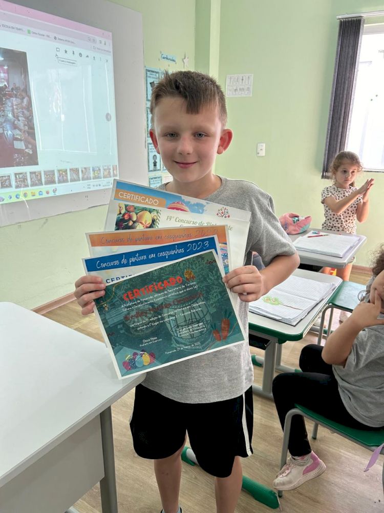E como acontece todo ano na cidade, as crianças participaram do Concurso de Pintura de Casquinhas. As casquinhas foram feitas no ambiente escolar e familiar de acordo com cada categoria de concorrência. Todos trabalharam em suas produções com muita dedicação, e como não poderia ser diferente, com o objetivo de ganhar o primeiro lugar. E após tanto esforço e empenho, o resultado não poderia ter sido outro, os alunos da Escola Municipal Raulino Horn, foram premiados, na categoria: Colagem da Modalidade Educação Infantil, o aluno Cristoffer Ryan de Lima dos Santos, ficou em 1º lugar. Na categoria: Técnicas Naturais, Modalidade Ensino Fundamental I, o aluno Weslley Nathan Oestreich ficou em 1º lugar e o aluno Miguel Kling Borchardt, ficou em 2º lugar na Categoria Colagem.