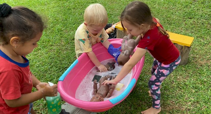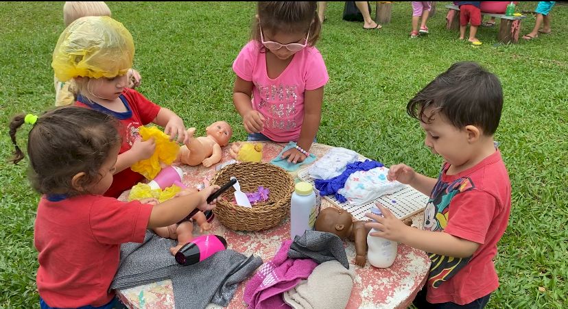 Cada um escolheu sua boneca e lavaram as mesmas com água e sabão, em seguida os cuidados continuaram em secá-las, passar creme, talco, colocar fralda, roupas e até acessórios.