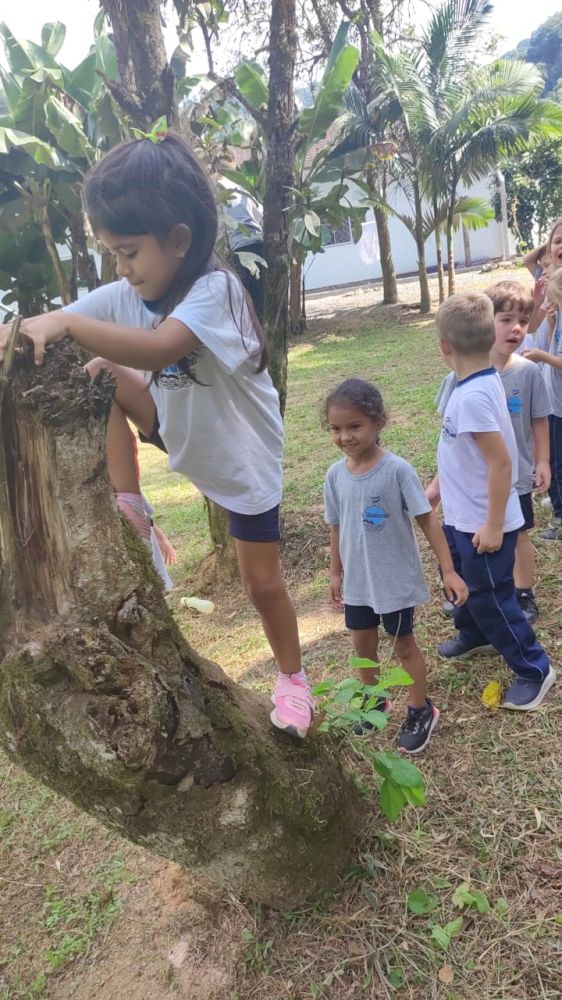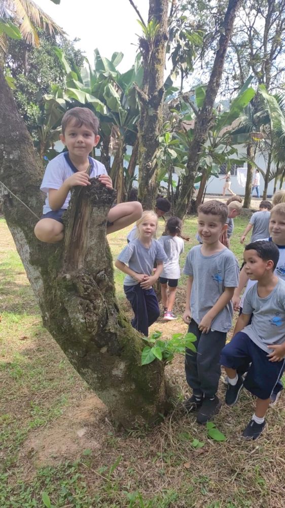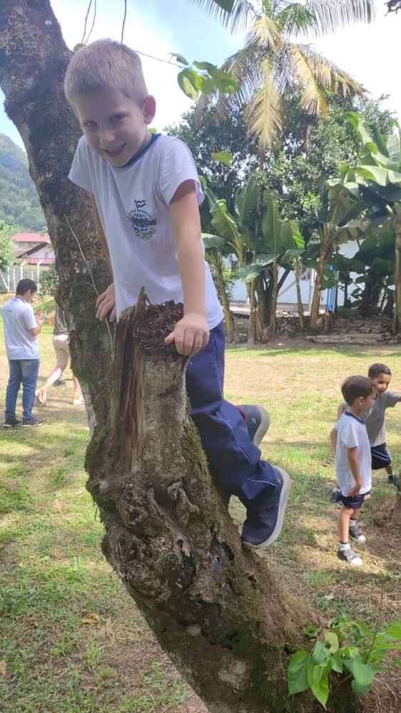 Outro desafio apresentado aos alunos foi escalar as árvores. Para a maioria, foi uma tarefa fácil, enquanto outros encontraram mais dificuldades. Na hora de descer, alguns conseguiram pular, enquanto outros não tiveram a coragem necessária.