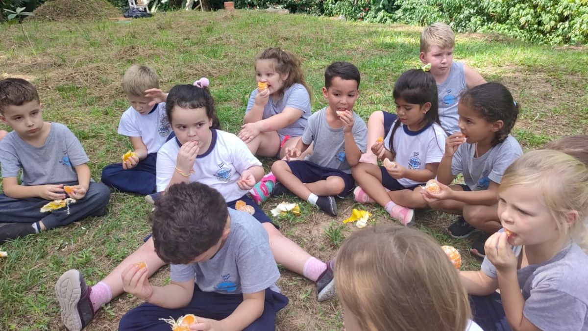 No dia 04 de abril, a turma do 1° ano integral optou por realizar o "Momento da Frutinha" de forma diferente. Decidimos saborear a fruta, que foi a tangerina, no bosque, à sombra das árvores. Esta atividade proporcionou às crianças a oportunidade de explorar diversas habilidades.