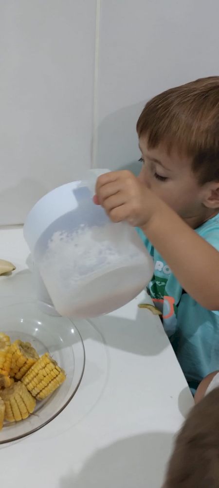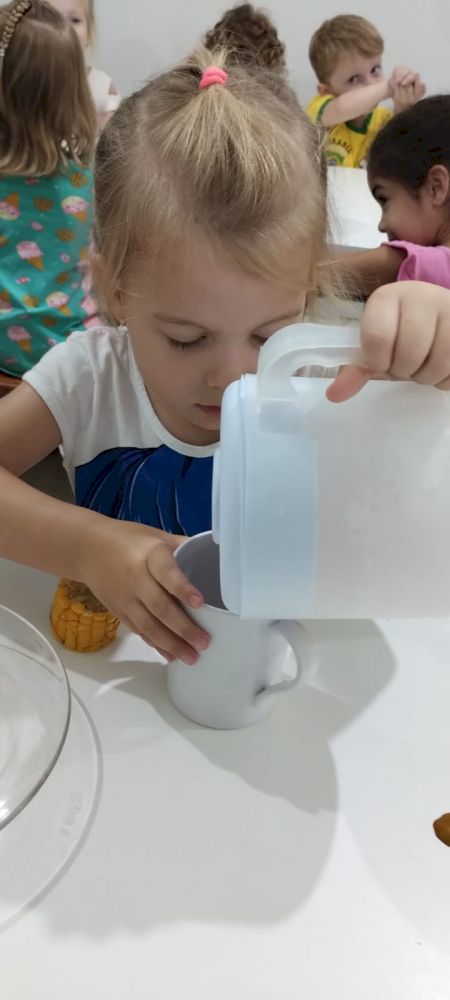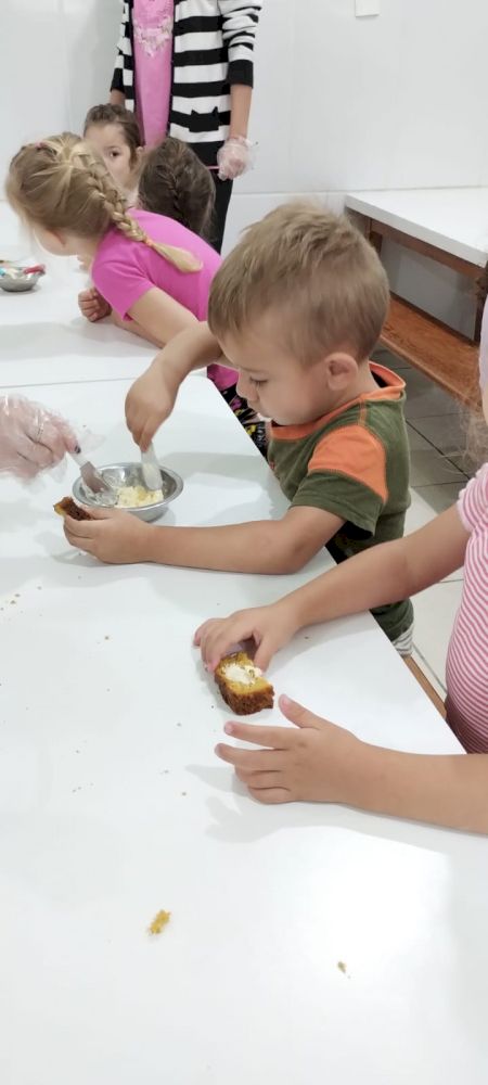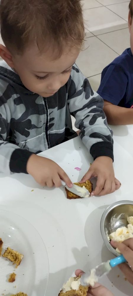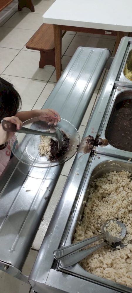 Nos lanches, as “auxiliares de serviços gerais da cozinha” deixam organizado o pão cortado, a manteiga/ nata em potinhos com facas sem ponta e sem cerra para passar no pão. No almoço, a turma é dividida em dois grupos, para melhor organização e para que possam se servir com tranquilidade.