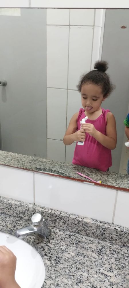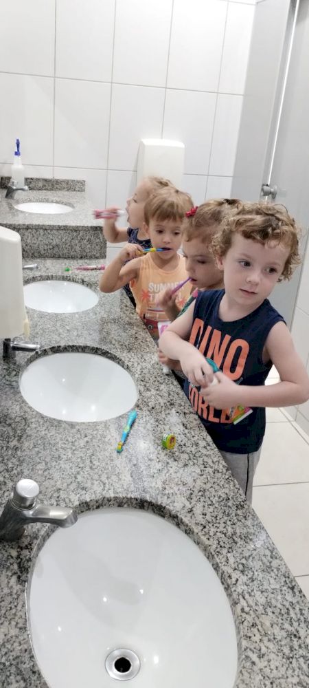 Nos momentos de higiene e uso do banheiro, convidamos as crianças a lavarem bem suas mãos antes e depois das refeições e ao utilizar o banheiro. Após os lanches, as crianças são convidadas a pegarem seu kit escovação em sua bolsa, e se dirigirem ao banheiro, ali cada criança se organiza, pega a escova, coloca a pasta dental e fazem a escovação. Neste momento estão acompanhadas pelas professoras, incentivando sobre o uso correto da pasta e como escovamos os dentes. Sempre incentivando a autonomia.