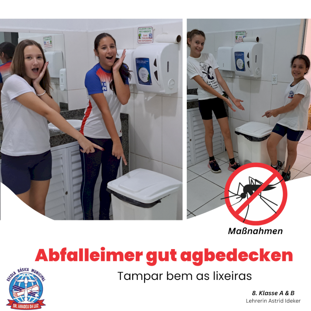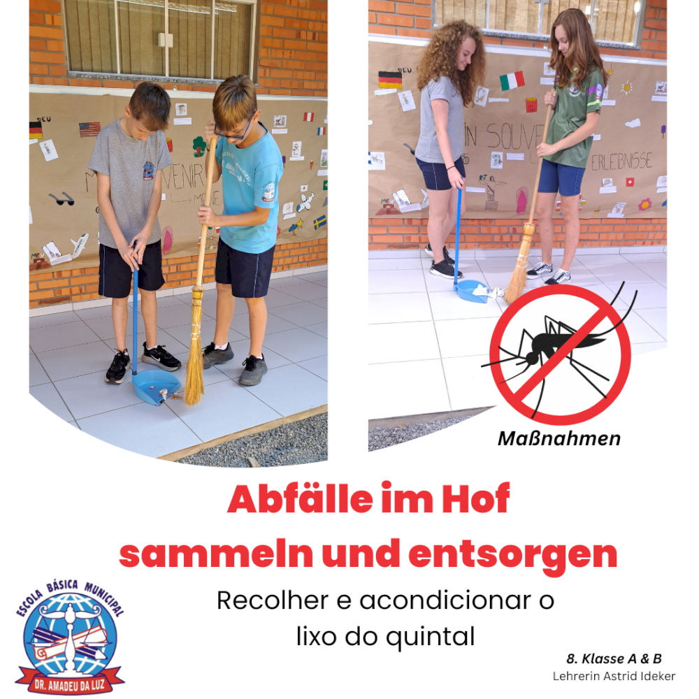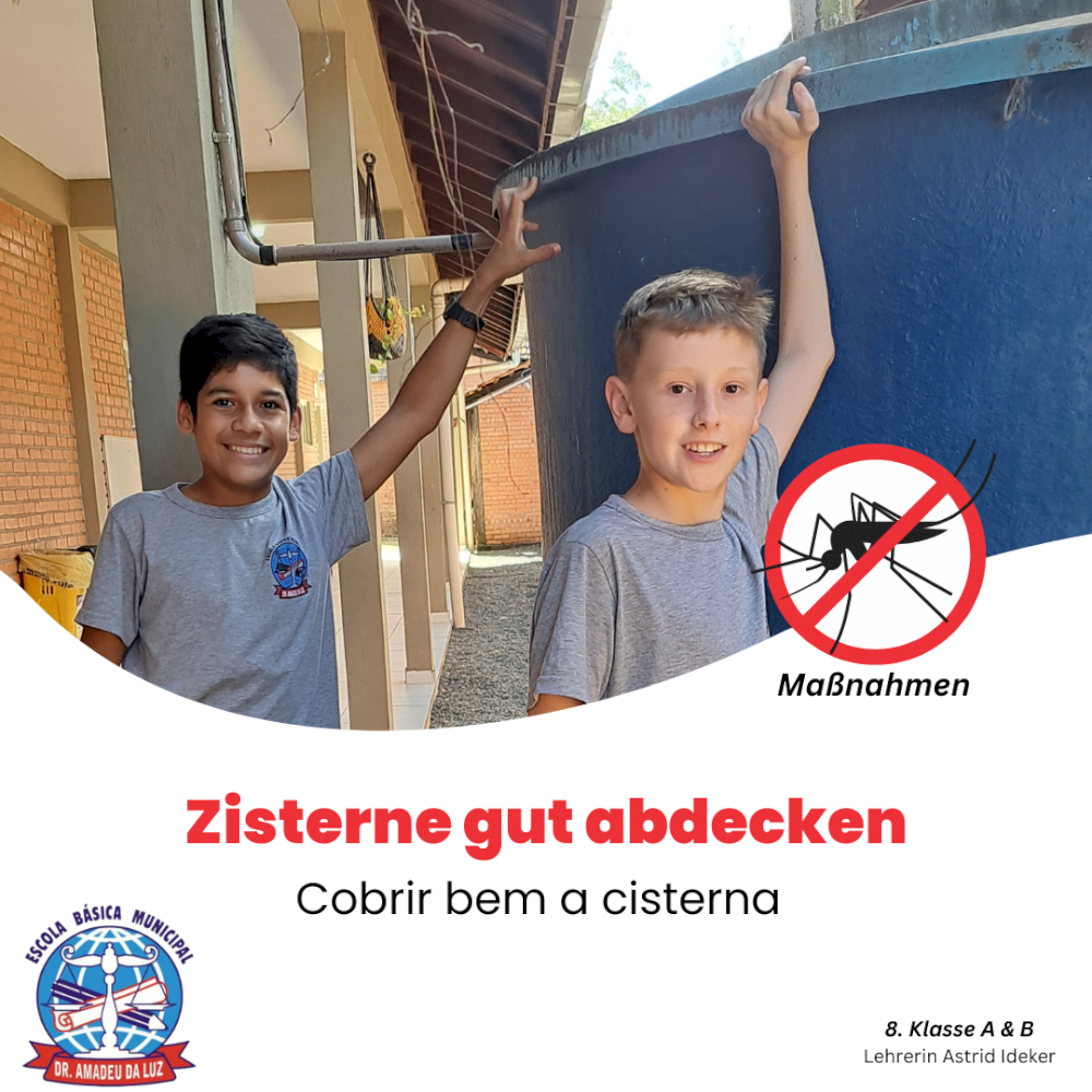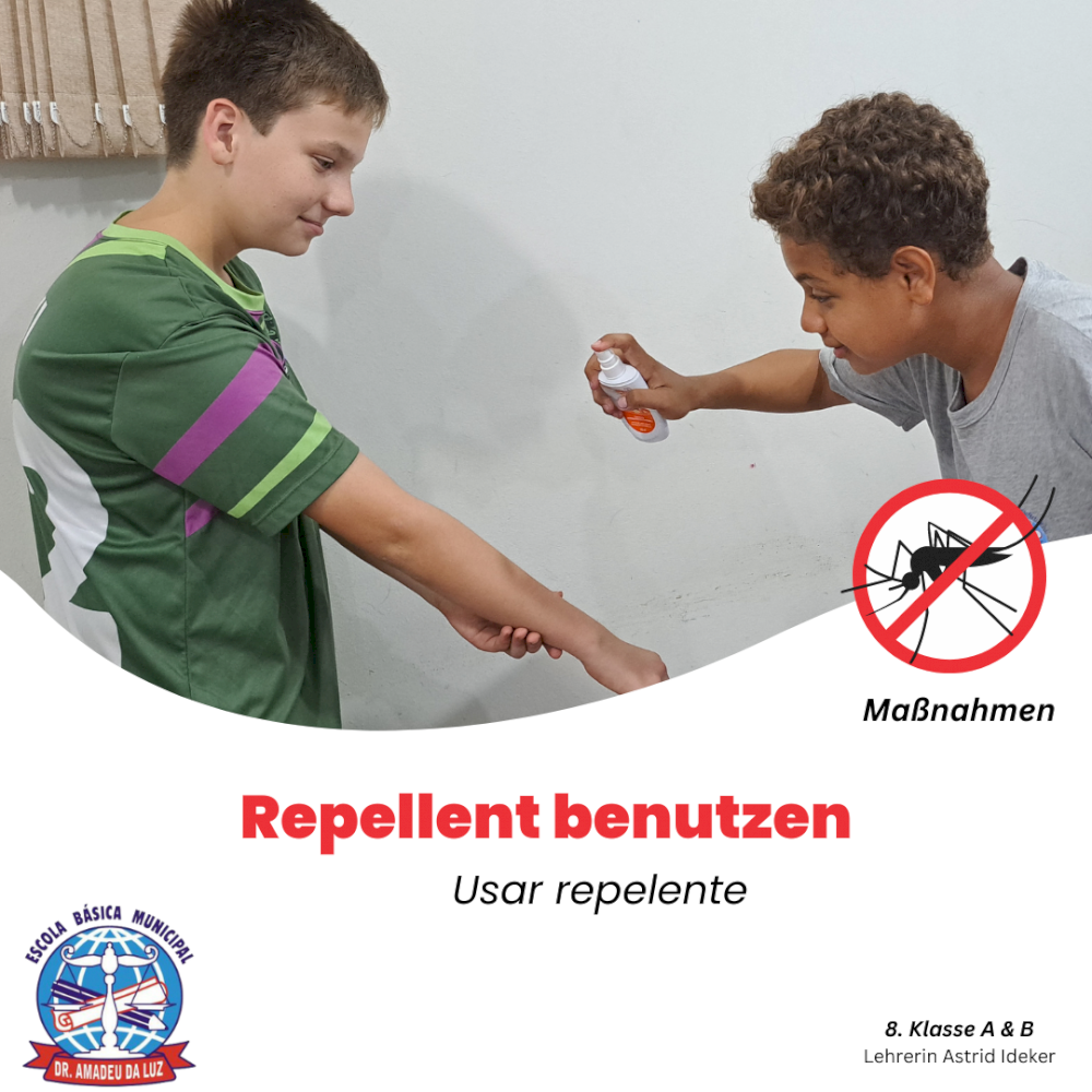 A professora do ensino bilíngue, Astrid Ideker, realizou uma série de atividades com os alunos, em várias áreas do conhecimento estudadas, todas em alemão, com o objetivo de conscientizar os estudantes sobre a dengue.