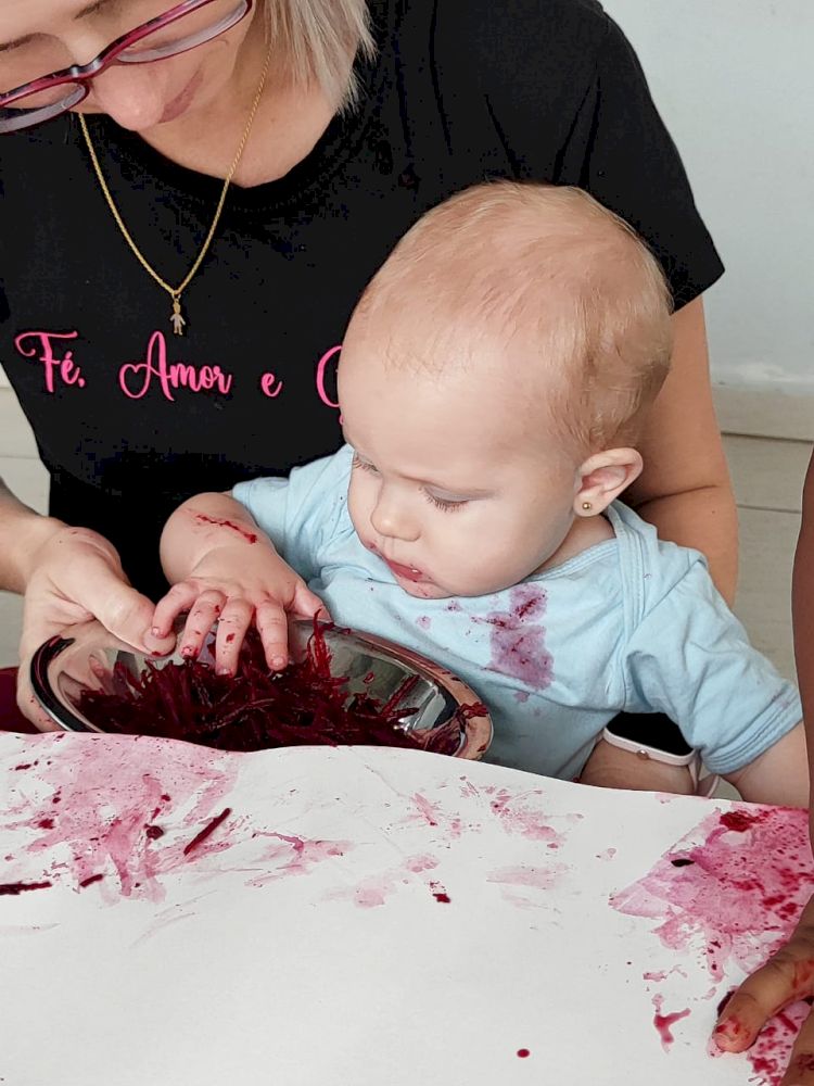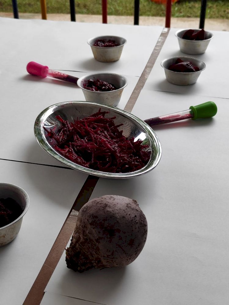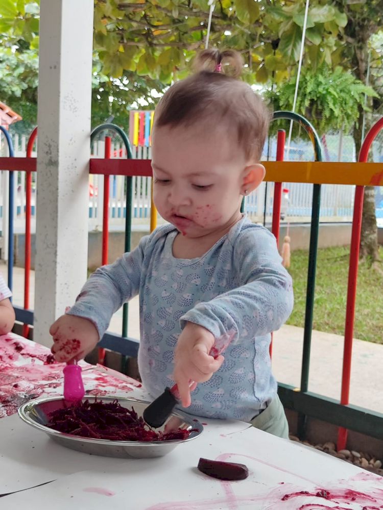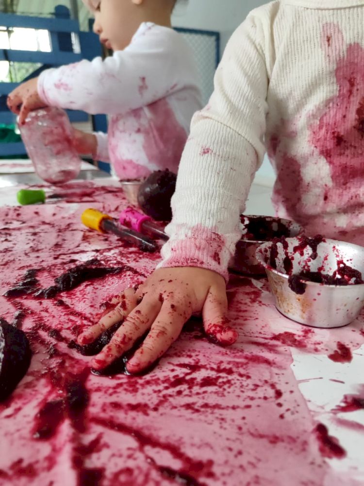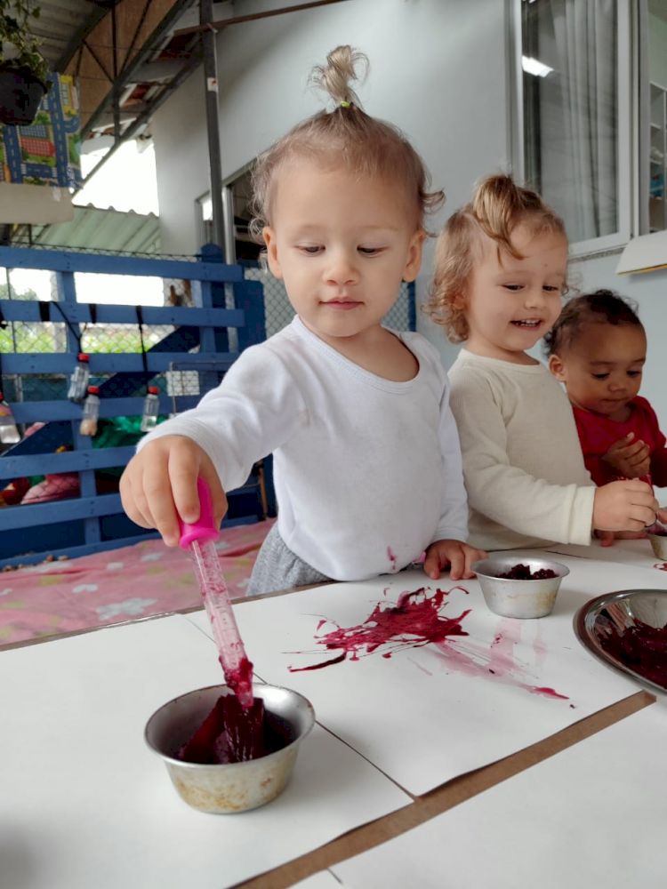 As crianças exploraram as tintas da beterraba em um espaço organizado com potes, papel e conta-gotas, incentivando a criatividade e a coordenação motora.