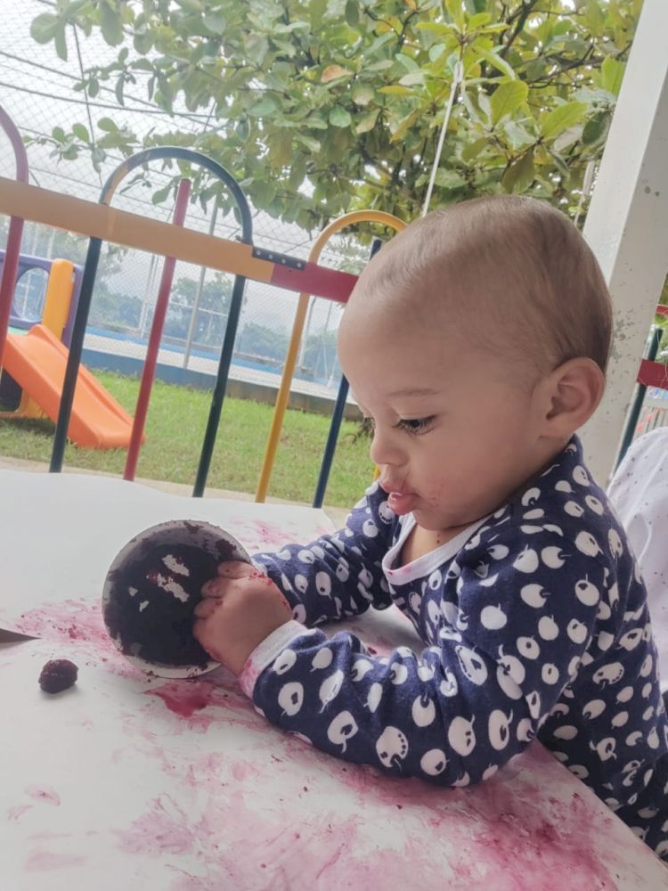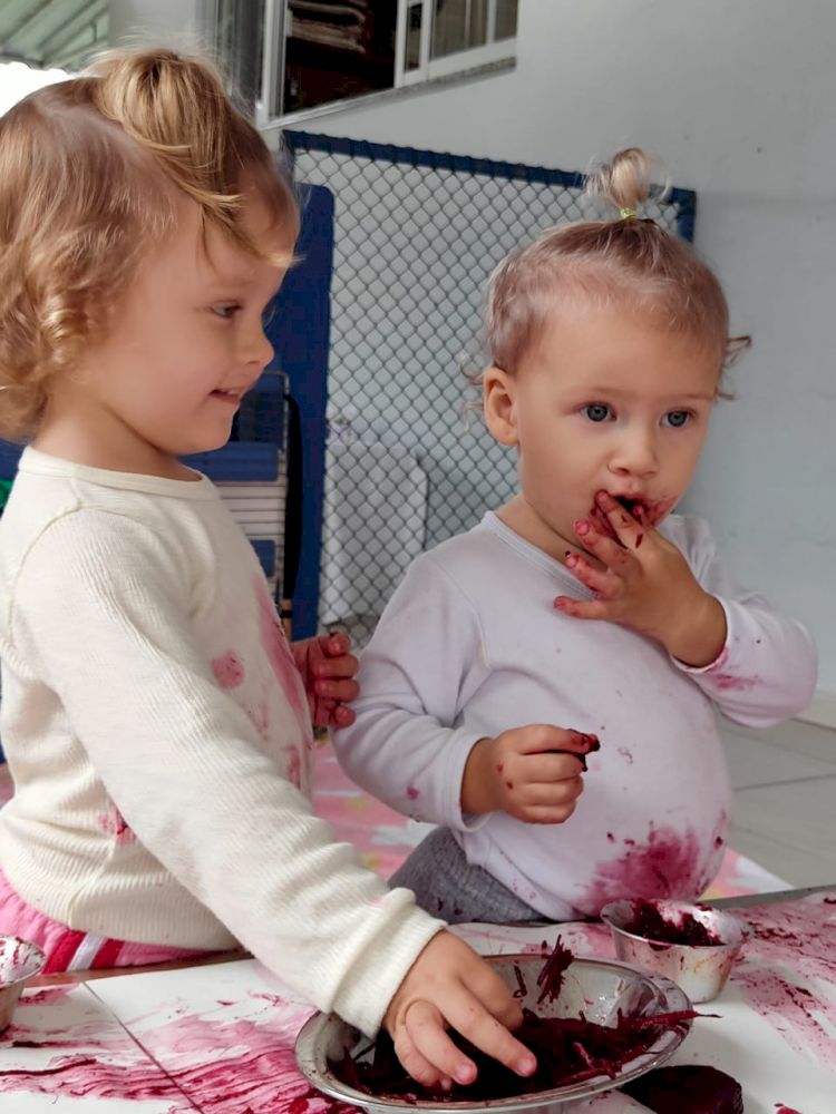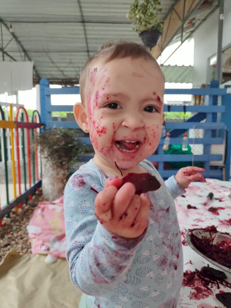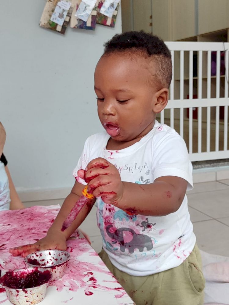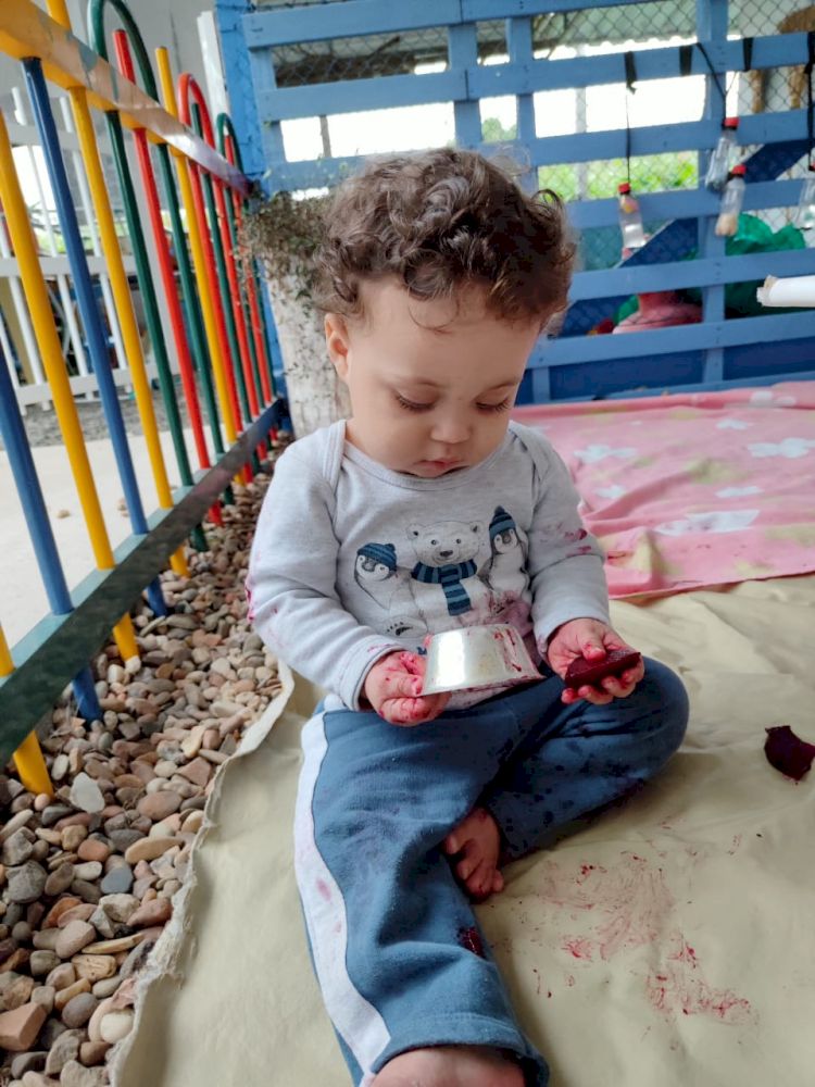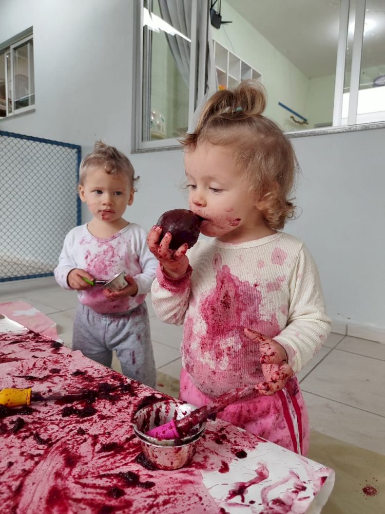 As crianças exploraram as tintas da beterraba em um espaço organizado com potes, papel e conta-gotas, incentivando a criatividade e a coordenação motora.