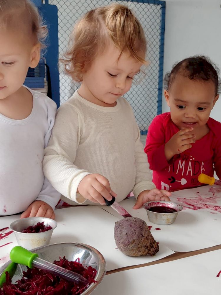 Usando quatro beterrabas, criamos uma atividade sensorial para as crianças com diferentes tipos de tintas: