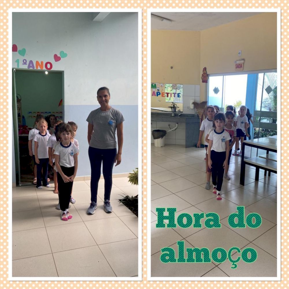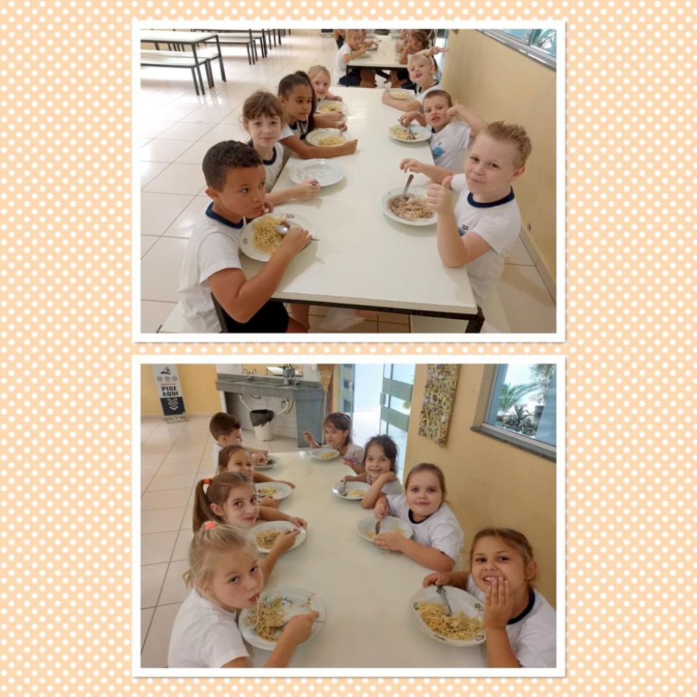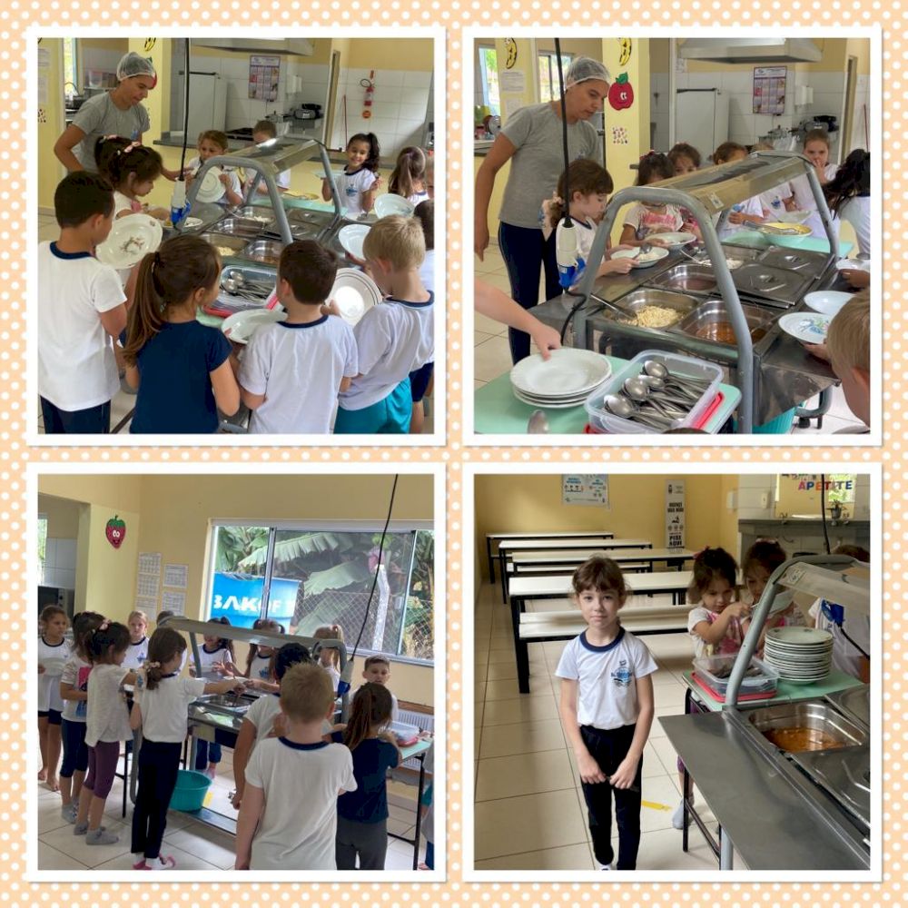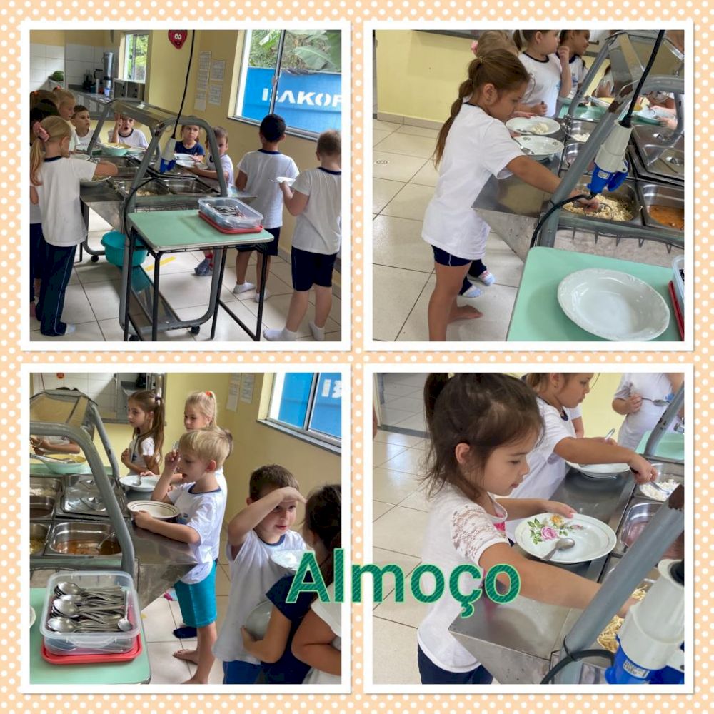As crianças têm autonomia para se servir e almoçam em um ambiente tranquilo, mostrando o respeito da escola para com elas. Após o almoço, elas seguem para a sala para a hora do soninho, sob os cuidados das professoras Lucinete Alves da Silva e Josiane Anesi Bohmann.