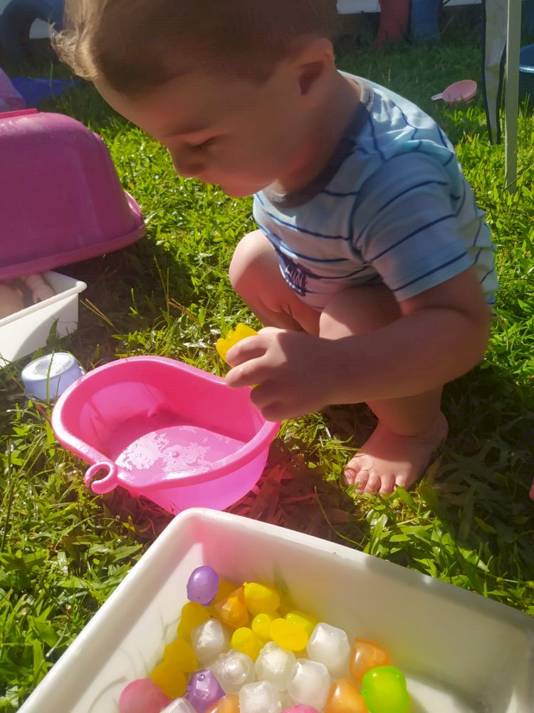 Professoras do CEI planejaram um espaço ao ar livre, com várias opções de brincadeiras feitas com água