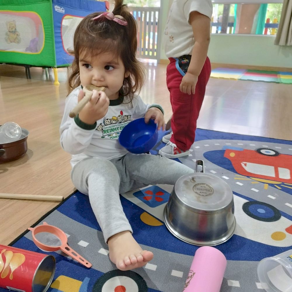 A professora pergunta para as crianças ‘’Quem fez comidinha gostosa?”. Agatha responde ‘’mamam ‘’. Toda alegre com a panela e talher mexendo, ela faz de conta que fez comidinha deliciosa. As crianças são estimuladas a imaginar, criar e fazer, usando objetos do convívio diário como as panelas. Aprendem a tomar decisões e assumir responsabilidades. Sendo protagonista de sua própria vivência.