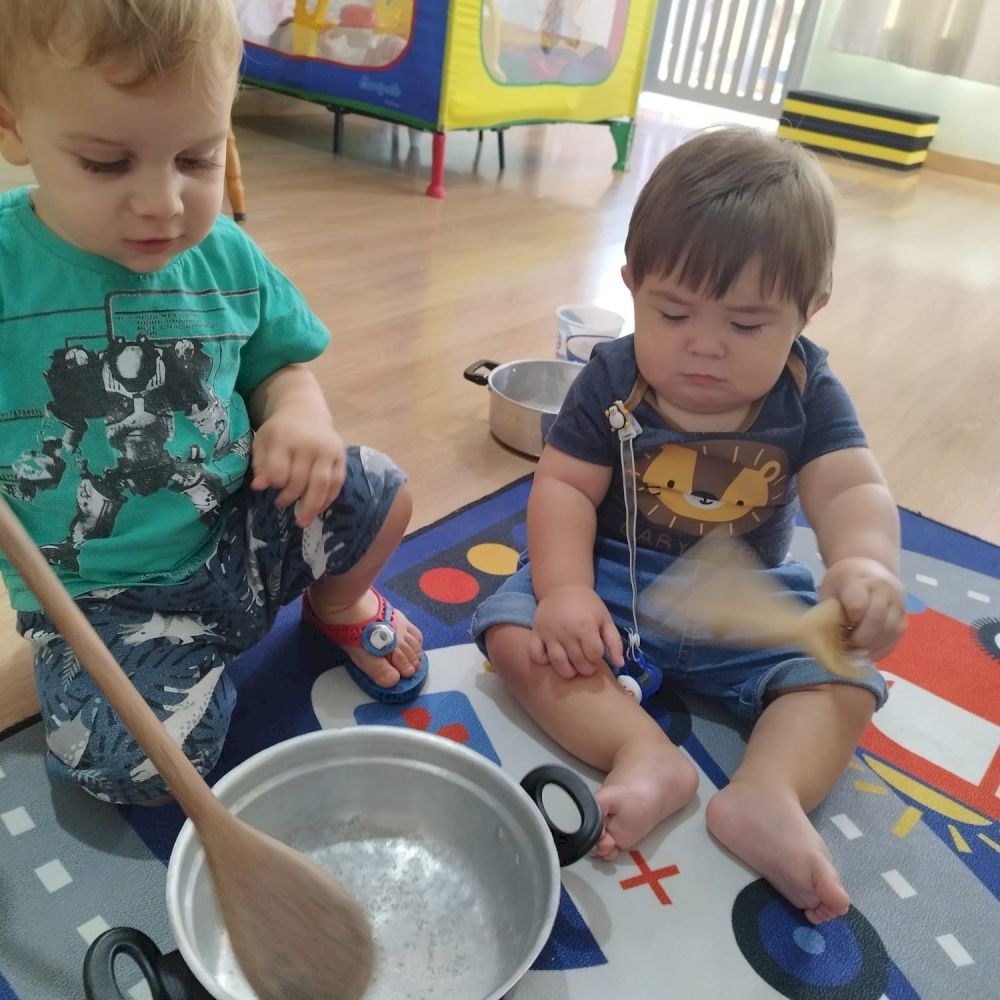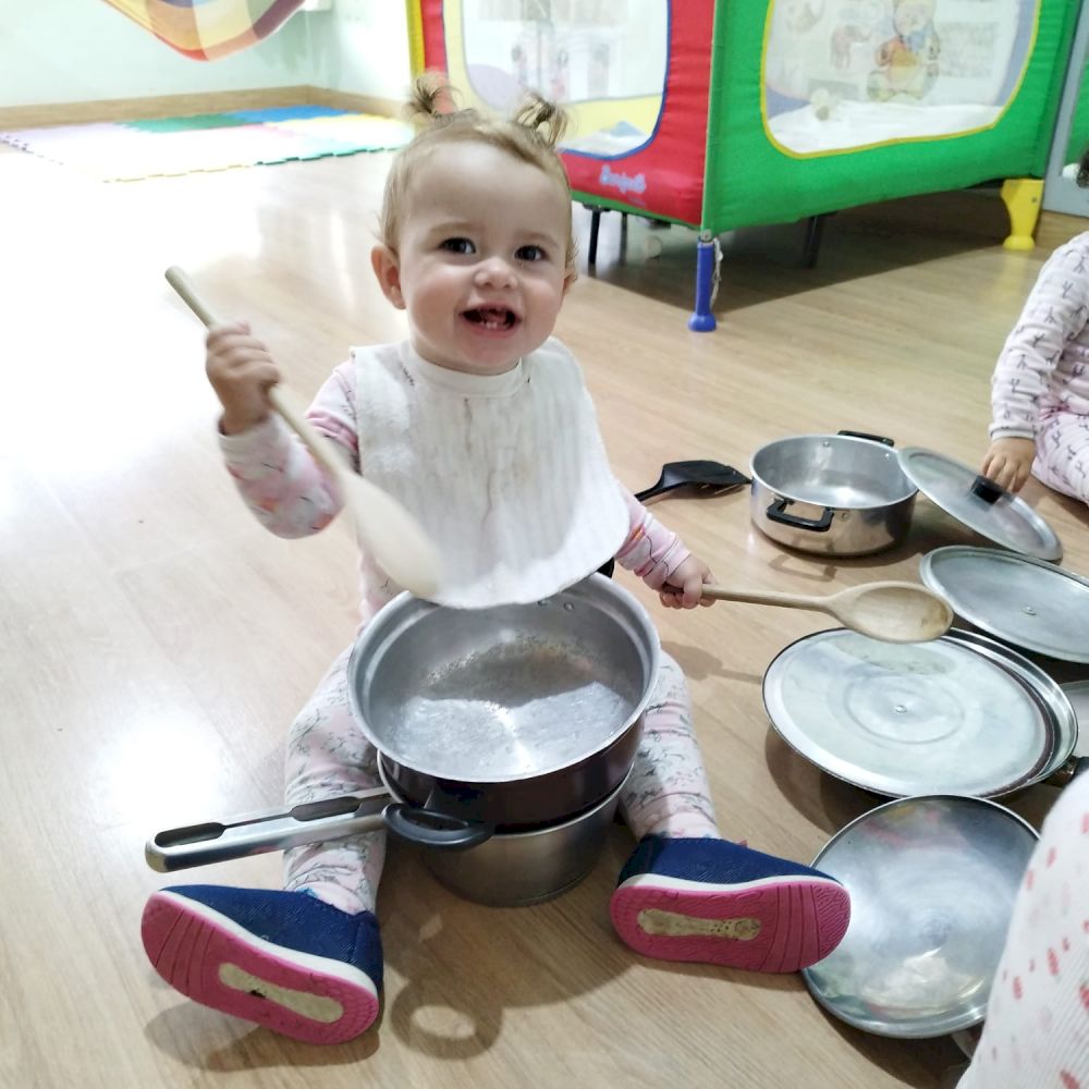 O ato de brincar vai muito além do entretenimento é um mundo de possibilidades e imaginação. Brincadeiras que envolvem ludicidade contribuem diretamente para desenvolvimento cognitivo, motor e social das crianças. O ato de brincar com panelas não seriam diferentes. Várias panelas e objetos de fazer comida foram oferecidos à elas.