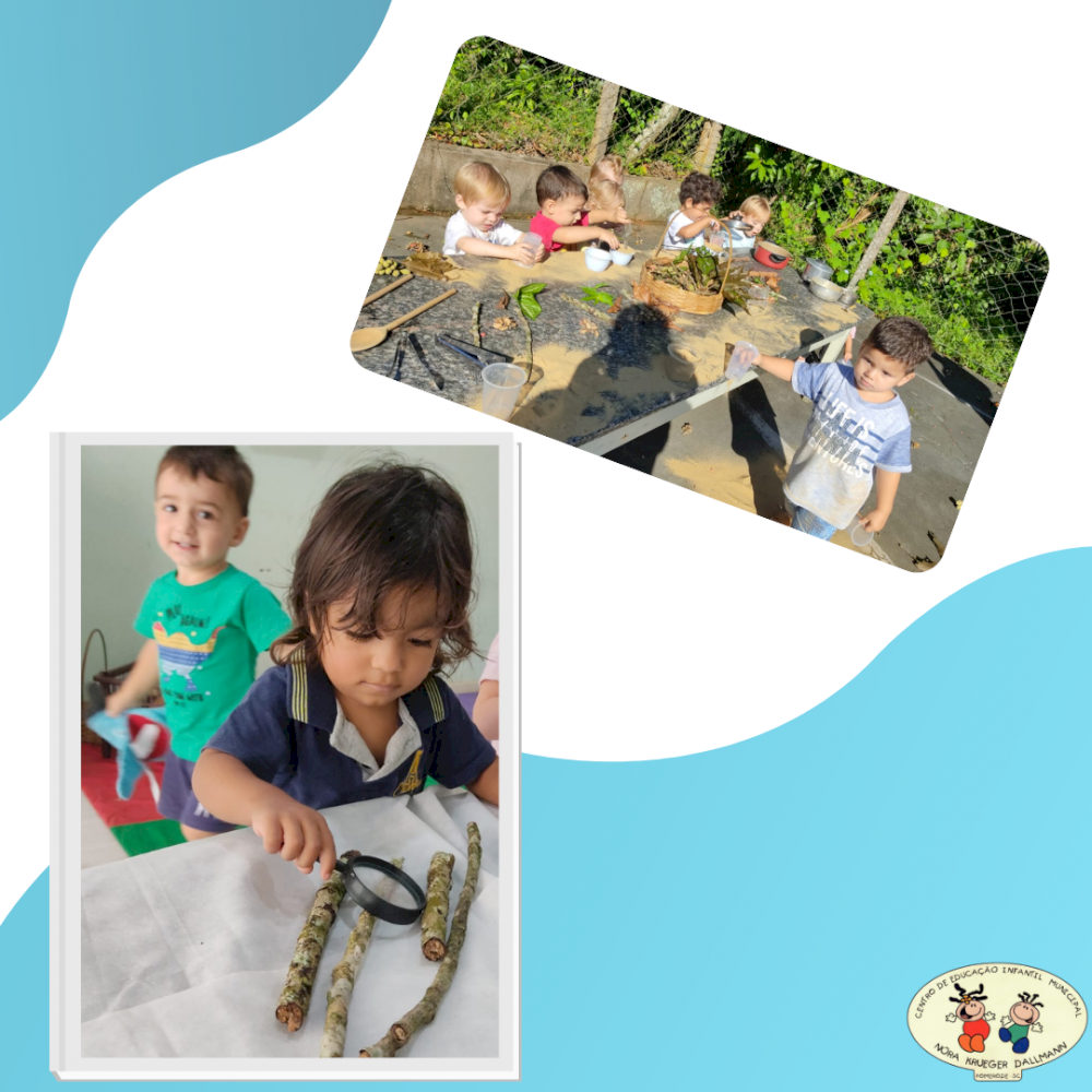Nossa aventura rumo à descoberta das propriedades, possibilidades e potencialidades com a natureza só está começando, como uma gostosa brincadeira. A vivência com materiais naturais e ambientes amplos proporciona aos pequenos uma experiência riquíssima. Por ser um material não estruturado, permite a exploração tátil, sendo um excelente meio de estimular a criatividade e desenvolver a coordenação motora ampla e fina. As crianças ficam encantadas com as inúmeras possibilidades de criação e exploração. Quando as propostas envolvem elemento naturais e pesquisa então, é pura diversão!
