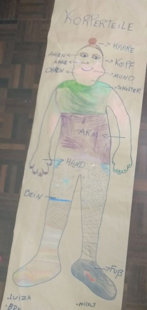 A turma aprendeu todas as partes do corpo em alemão envolvendo as quatro habilidades: ouvir, falar, ler e escrever, através de atividades dinâmicas na lousa digital. A partir disso foi desenvolvido um trabalho com a turma, no qual a turma fez o contorno do corpo de um colega, além de nomearem cada parte do corpo humano aprendida.