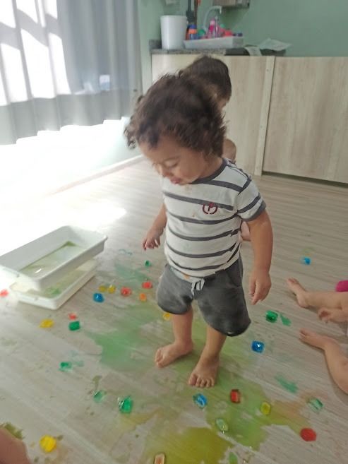 Ao longo do primeiro trimestre, inúmeras foram as experiências sensoriais ofertadas as crianças da creche 1C, permitindo o manuseio e a exploração de diferentes materiais, propiciamos assim, o contato com a textura das bolinhas de gel, as possibilidades de manuseio do jornal, as descobertas advindas do manuseio do plástico bolha, entre outras propostas.