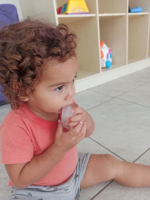 Alguns elementos, além da textura possuem uma temperatura diferenciada, permitindo que a criança realize novas descobertas, assim ocorre com o gelo, o qual foi ofertado de diferentes modos para as crianças. Inicialmente dentro das bandejas de experimentação o gelo foi disponibilizado com diferentes tamanhos, permitindo o manuseio. A reação das crianças foi distinta, algumas tocaram no gelo e de imediato recolheram a sua mão esfregando uma na outra, outras estremeceram no primeiro contato e algumas além de sentir o gelo com as mãos, levaram a boca.