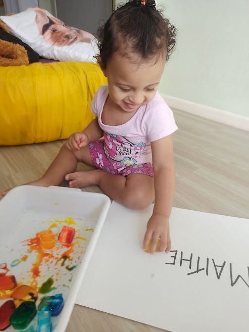 O gelo também foi utilizado como material de pintura, tingido com corante alimentício. A coloração do gelo atraiu de imediato o interesse as crianças, as quais exploraram de diferentes modos, observando a alteração da coloração sobre a folha branca, bem como a sua fusão.