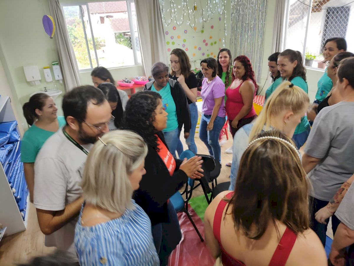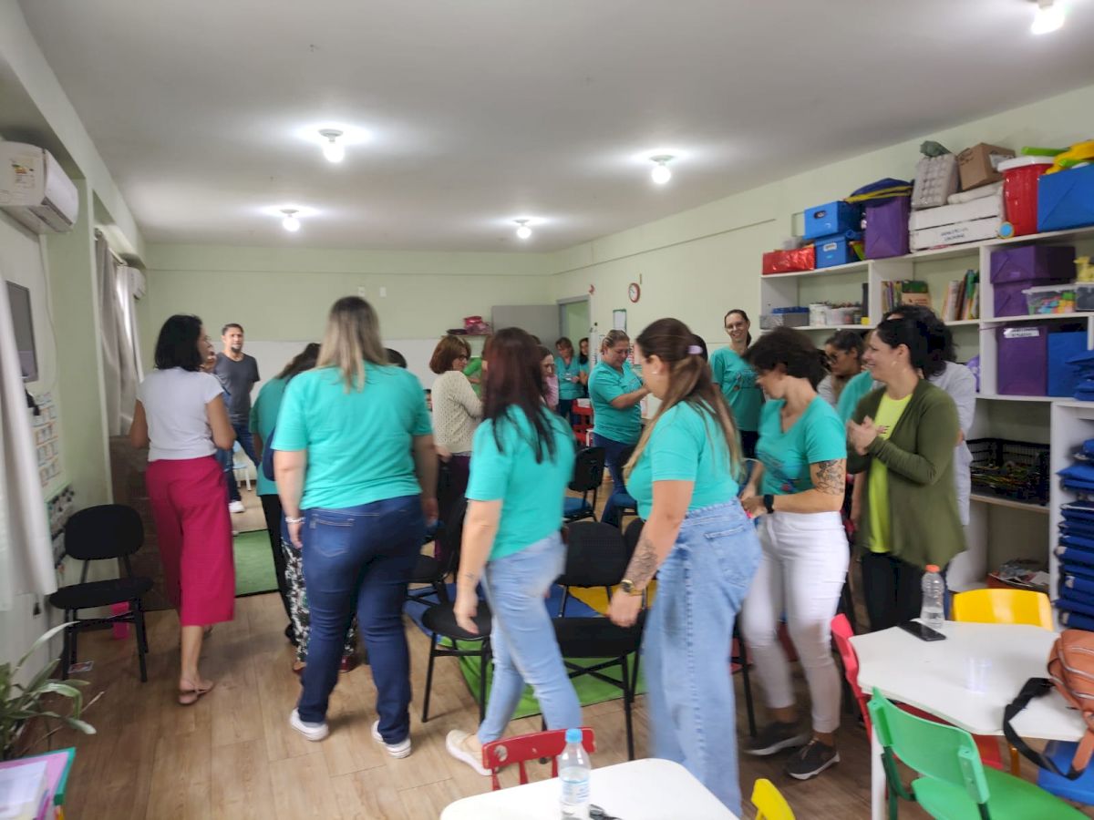 No período da tarde o CEIM Professora Dorotéa recebeu os profissionais do CEIM Rosa Borck que foram recepcionados com uma apresentação musical, conheceram os espaços, conversaram. Esse momento possibilitou a troca de experiência entre os profissionais.