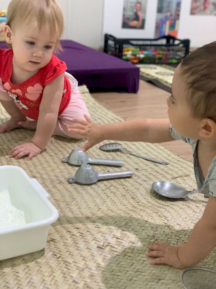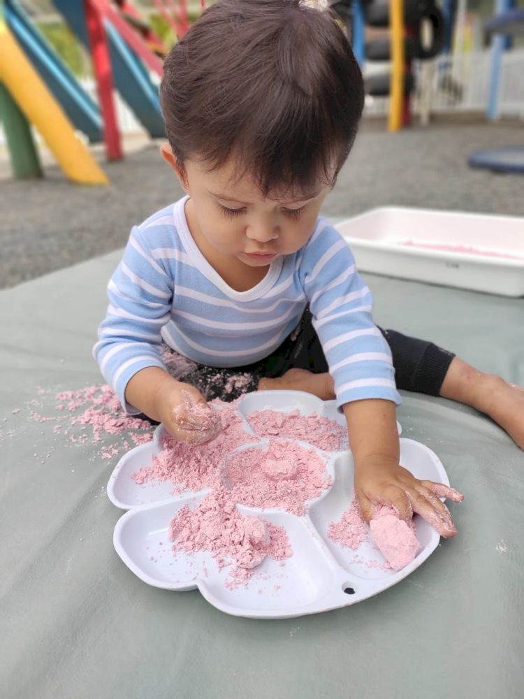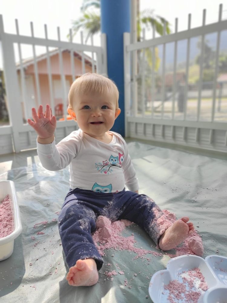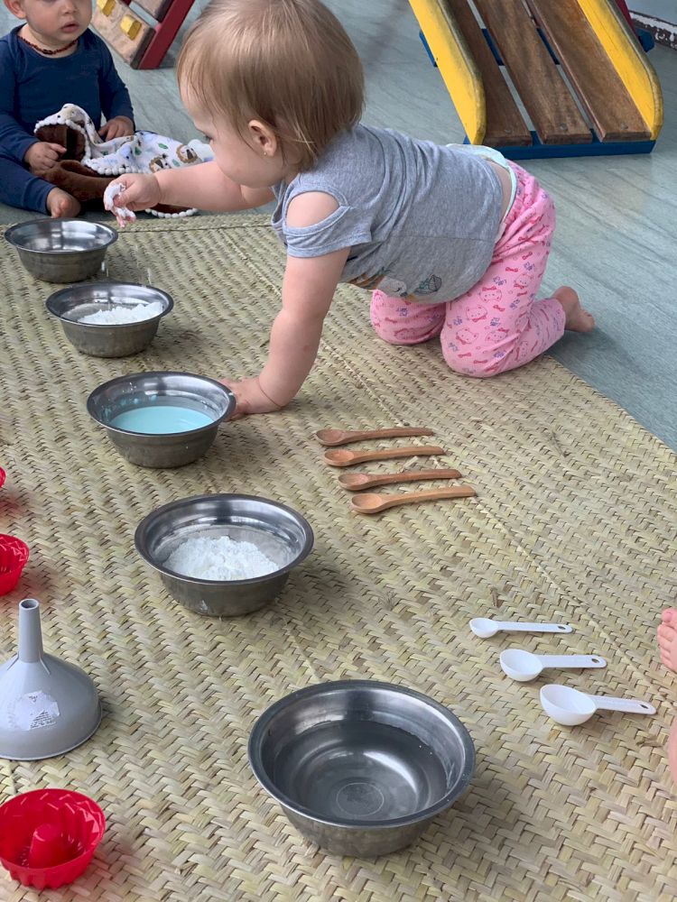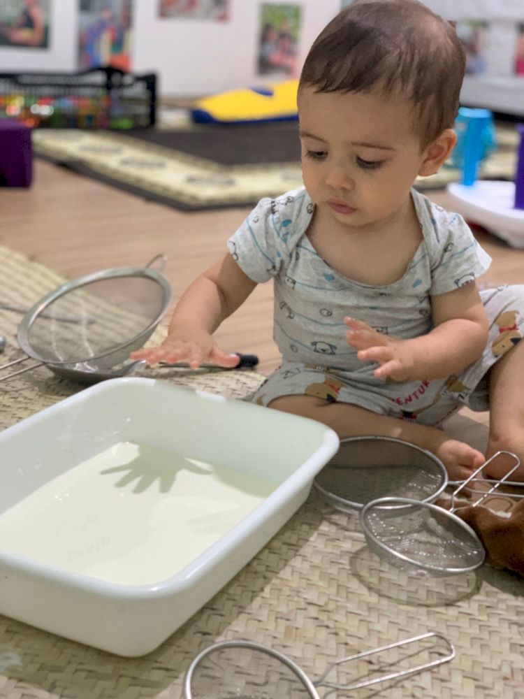 A turma da Creche 1 A vem se mostrando muito ativa, participativa e com a curiosidade aguçada, principalmente quando o assunto é experimentos feitos a partir do elemento água. Sempre que vamos a torneira para lavar as mãos e realizar nossa higiene diária é nítida alegria e atenção deles nos movimentos da água, textura, temperatura e afins. Foi então que as possibilidades de interação se ampliaram e partir disto começamos a dispor de vários materiais para que pudessem ampliar a gama de testes e experiências. Primeiramente oferecemos bacias de vários tamanhos e formas somente com água, a liberdade de interação e entusiasmo foi muito válida, em um segundo momento oferecemos água colorida também em vários formatos de vasilhas e bacias para que iniciassem o processo de observação e identificação de uma apresentação diferenciada do mesmo elemento.