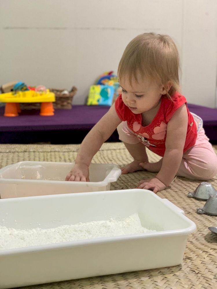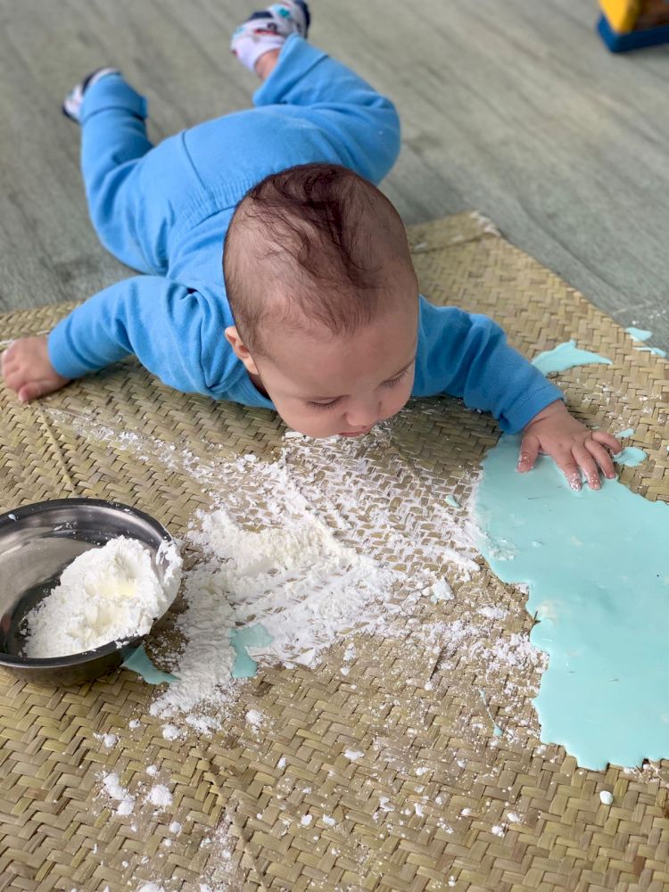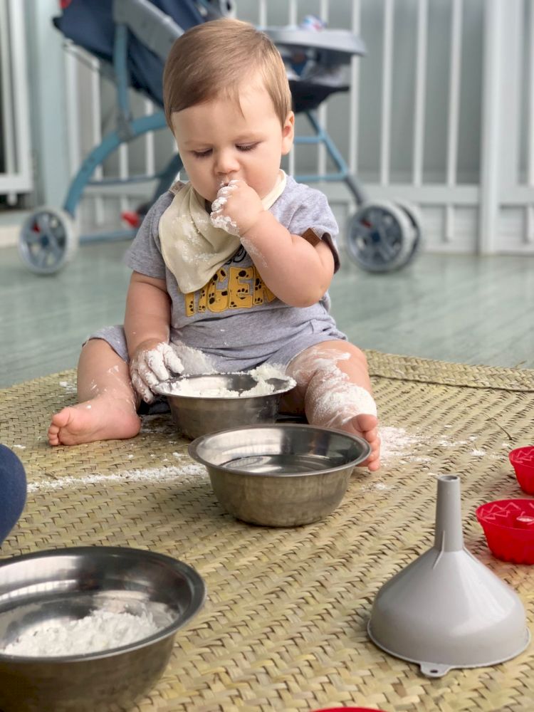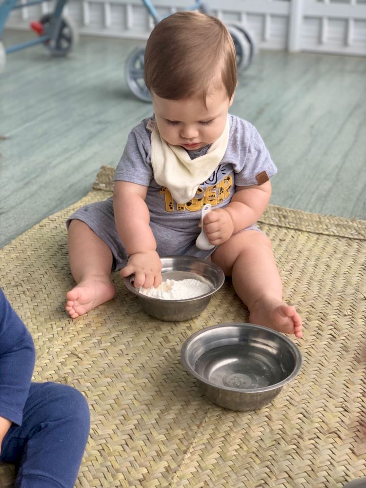 Agora, que as crianças já estavam mais habituadas com os formatos de apresentação da proposta, acolhidas pelo elemento água e envolvidas com o projeto, iniciamos os experimentos com os elementos secos para que pudessem observar e perceber as diferentes texturas, cores e temperaturas dos mesmos e relacionassem as diferenças com os elementos molhados que foram oportunizados anteriormente. O amido de milho foi oferecido em sua forma natural seca dentro de várias bacias/vasilhas com formatos diferenciados, ampliando as possibilidades de criação de hipóteses e experimentos. Durante esta experimentação os bebês apresentaram reações inéditas e inusitadas, em alguns momentos alguns se sentiram tão íntimos do elemento que passaram pelo corpo todo.
