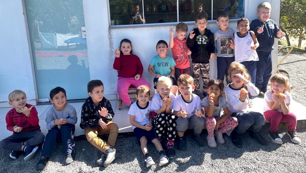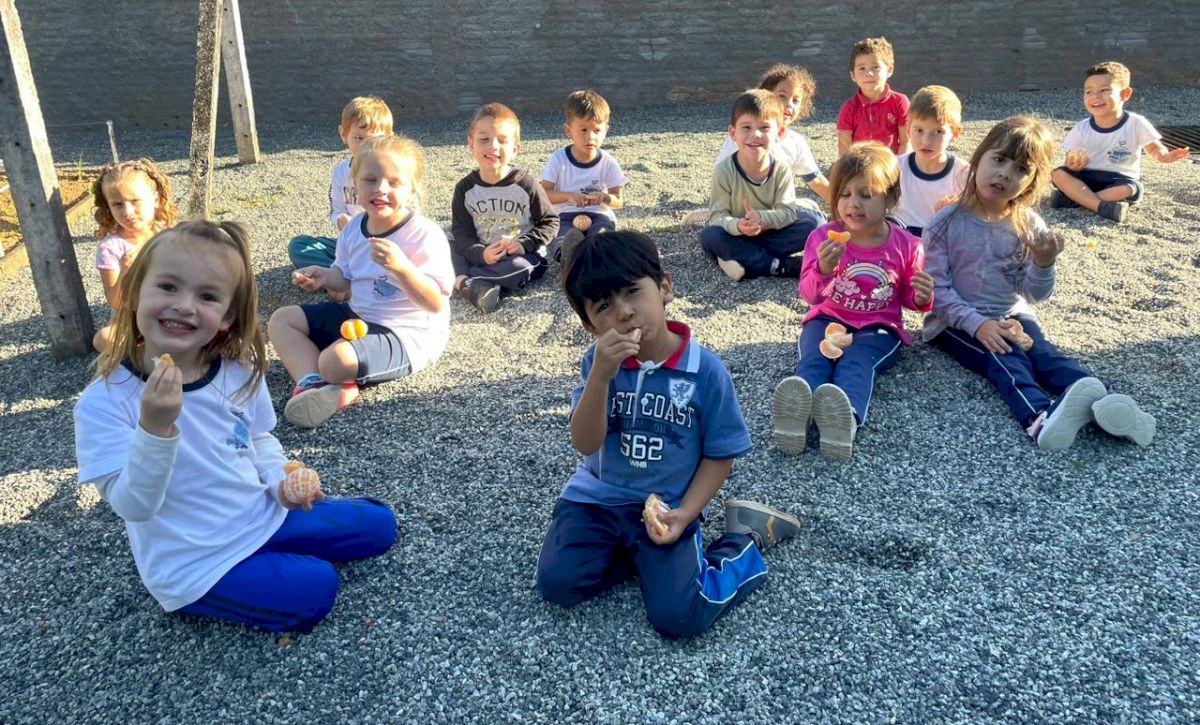 Procuramos propor momentos como estes aqui na escola. Temos um pomar com diferentes frutas (laranja, tangerina, limão).
